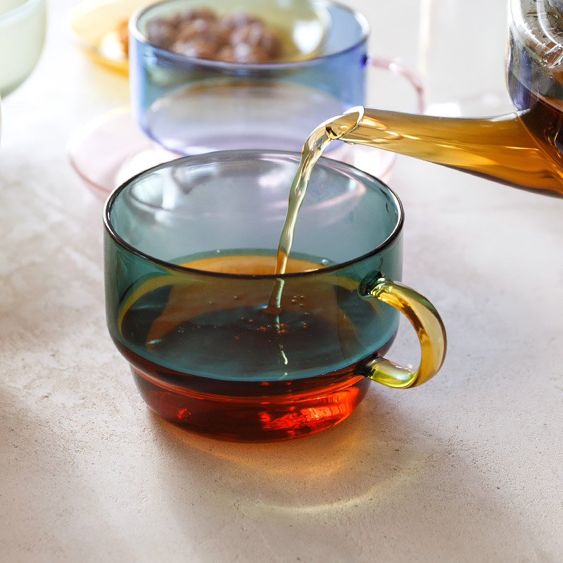バイカラーが目を引く耐熱ガラスのマグ。レンジ・食洗機OKの実用性に加え、スタッキング収納や持ちやすさにもこだわりが感じられます。重なった時の色のレイヤーも目に楽しい。妥協のないデザインが、日常をちょっと贅沢にしてくれるカップです。