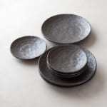 「国産・美濃焼」「いぶし銀風」の食器シリーズ。金属のような重厚感を持ちながら、陶磁器の温もりを併せ持つ質感は、手に取るたびにその「造り」の良さを実感させてくれます。手仕事を感じさせるマットな質感と、光の加減で表情を変える独特の風合いが魅力。個々に模様の出方が異なり、一点もののような個性をお楽しみいただけます。