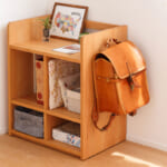 ランドセルはもちろん、A4サイズのファイルや本など、デスク周りで散らかりがちなアイテムをひとまとめに、すっきり収納できます。ランドセルは脇のフックに掛けるほか、棚中央の段に寝かせて置くこともでき、使い方に合わせた整理が可能です。毎日の片付けが自然と身につく、使いやすさと整った空間づくりをかたちにしました。
