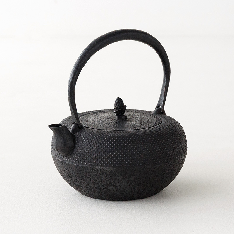 表面に施されたアラレ文様は、表面積を広げて熱を逃がしにくくするという先人の知恵。内面は伝統の「釜焼き」仕上げで、水が驚くほどまろやかになり、不足しがちな鉄分も自然に補えます。 使い込むほどに艶を増し、表情を変えていく黒。10年後、20年後が楽しみになる、確かな一級品を迎えませんか。