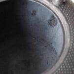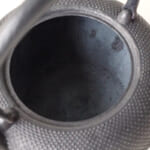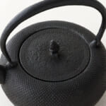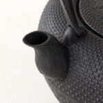 鉄瓶のアラレ模様は、表面に霰(あられ)のような小さな突起を規則正しく並べた、伝統的な文様です。見た目の美しさだけでなく、厄除けや無病息災といった願いが込められ、古くから暮らしの道具に用いられてきました。熱が均一に伝わりやすく、手に取ったときに滑りにくいなど、実用面でも理にかなったデザインです。