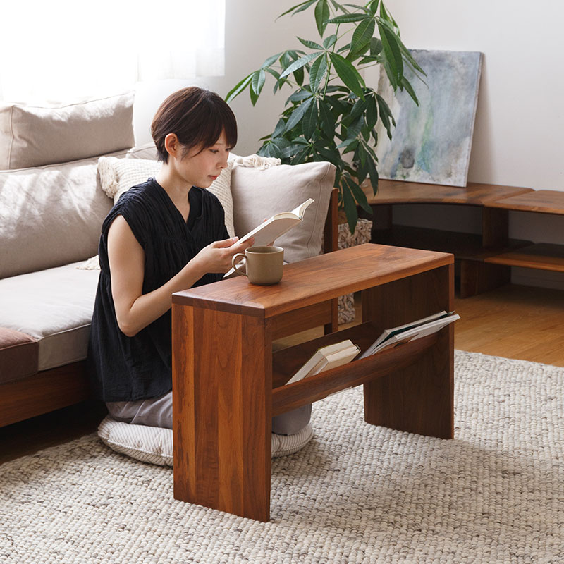 ソファの上に座って読書をしたり、新聞を読んだり…。まったりくつろぎながら読みかけの本などを収納することもできるサイドテーブル。リモコンなども仕舞うことができるのでソファ周りをすっきりと見せることができます。テーブルの上にはコーヒーなどを用意して、思い思いの時間をお過ごしください。