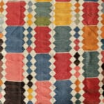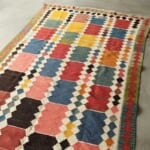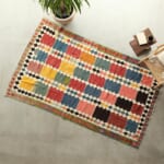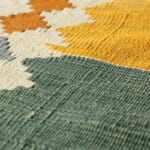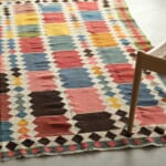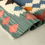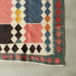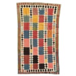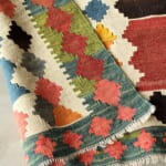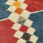 ギャッベの織り手として名高いカシュガイ族のキリムはカシュガイキリムと呼ばれ、幾何学文様を多彩に表現します。カラフルな配色ながら、経年で変化した色が落ち着いた雰囲気もあります。