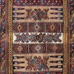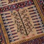 イラン北東部で織られたグーチャンキリムは刺繍のようなジジム織りが特徴です。こちらは生命の樹や魔除けのS字フック文様、ダイヤ柄など、多彩な文様で埋め尽くされたグレードの高いキリム。