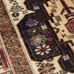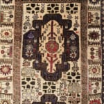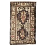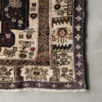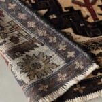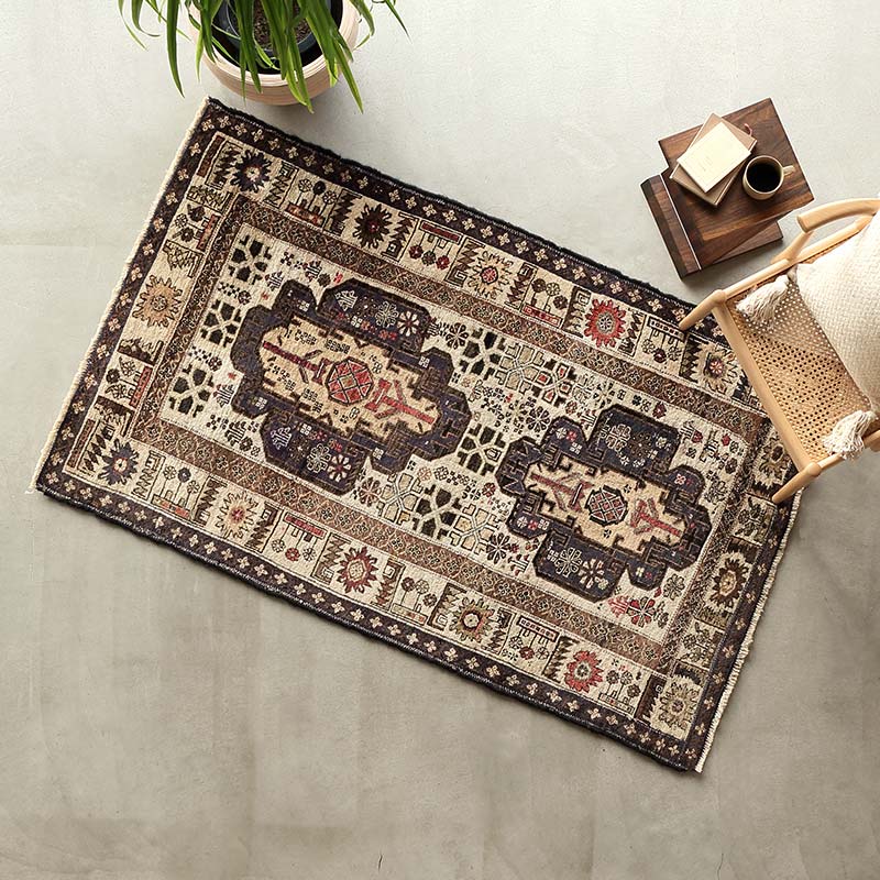 中央には個性的なメダリオン文様が上下に配され、周囲には細やかで多様なモチーフが隙間なく描かれています。伝統的な要素を感じさせながらも、定型に収まりきらない自由さがあり、他のバルーチラグとはひと味違った表情。