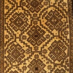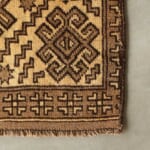 菱形文様のまわりに雄羊の角のような形が連なるフックドメダリオンが並び、トライバルラグらしい素朴で力強い印象の一枚です。