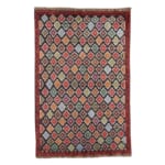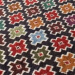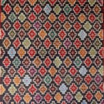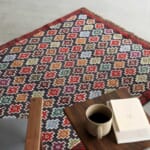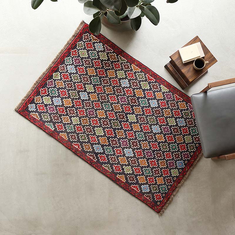 ヴィンテージらしい深みのある赤、澄んだ水色やグリーン、温かみのあるイエロー、そして落ち着いたパープルやブラウンが、まるで宝石を散りばめたモザイクのように細やかに織り込まれています。多色使いが生み出す絶妙なこなれ感は、どんなお部屋にもスッと馴染んで格好よく決まります。