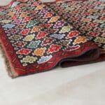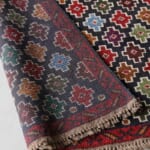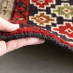 パイル(毛足)部分とフリンジの間には細いキリムエンドエリアが。量産品では省略されがちなこのキリムエンド。バルーチ族が手間暇を惜しまず織り上げた証拠でもあり、床に敷いた時に「端っこまで可愛い」という、所有する喜びを満たしてくれるポイントです。
