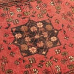 フィールドの中央には八角形のメダリオンが据えられており、濃いダークブラウン〜ブラックの地に、ピンク・ゴールド・テラコッタの丸い花弁が放射状に並んでいます。この花の集合体はロゼットと呼ばれる様式で、トルクメン絨毯のギュルとは異なり、よりペルシャ古典絨毯の影響を受けた表現です。