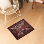 中央には古代文様のひとつ、トロフィー文様が描かれています。トロフィー文様には魔除け・守護の意味があり、玄関や寝床、祈りの場に使われるラグに多い文様です。