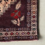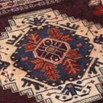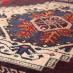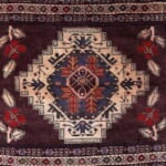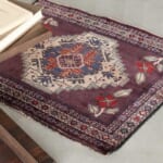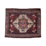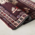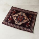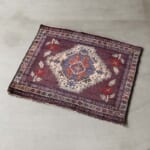 深みのあるボルドーを基調に、中央に大きなメダリオン(菱形文様)が配置された小さなトライバルラグ。メダリオンのまわりに描かれた、デフォルメされた赤い花の文様が印象的です。