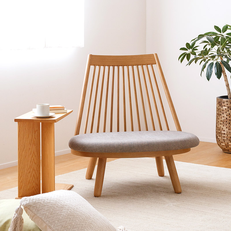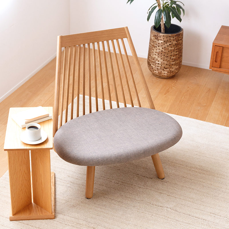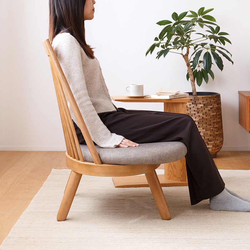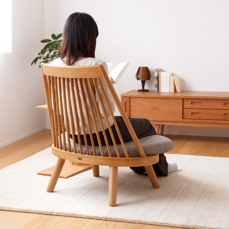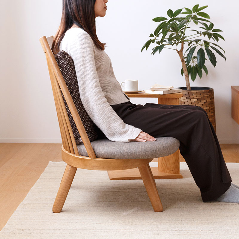 靴を脱いで畳やラグの上でゆったりと過ごす。このような床座の生活は世界でもアジアやイスラム文化圏の一部の国だけだそうです。床から近く立ち上がりやすい、日本らしい和の雰囲気に合うのはもちろん、ナチュラルな空間にもなじみやすいデザインであるこちらの椅子は、まさに「日本人のためにつくられた椅子」ではないでしょうか。