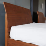 横から見るとヘッドボードが大きくカーブしているのがわかります。横になったときにボードが視界に入らず圧迫感を感じさせません。ぬくもりを感じるのはこの優しい曲線のおかげです。